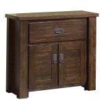 Trestlewood offers a rustic look with massive structural elements showcasing seven inch posts and planked panels with a unique distressed finish. This group is sure to make an impression yet to be forgotten. Multi-step rich, mesquite pine finish with sculptural distressing. Nightstand has metal positive stop drawer guides, solid pine drawer interior construction, and rustic hammered pulls with full back plate in a graphite finish.