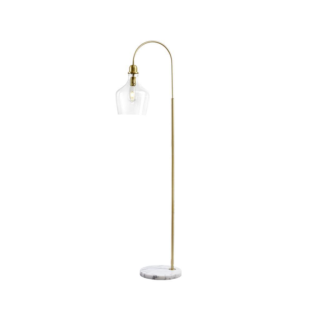 Illuminate your space with the simple, but elegant style of the Hampton Hill Auburn Floor Lamp. Featuring a bell-shaped glass shade this floor lamp has a white marble base and a gold metal finish that creates a luxurious look. With a 72-inch clear standard wire, this metal floor lamp easily adds a stunning update to any room in your home. Comes with a 2 year limited warranty. Professional installation and assembly is required. 1 Type-A light bulb is needed and NOT included. Spot clean only.